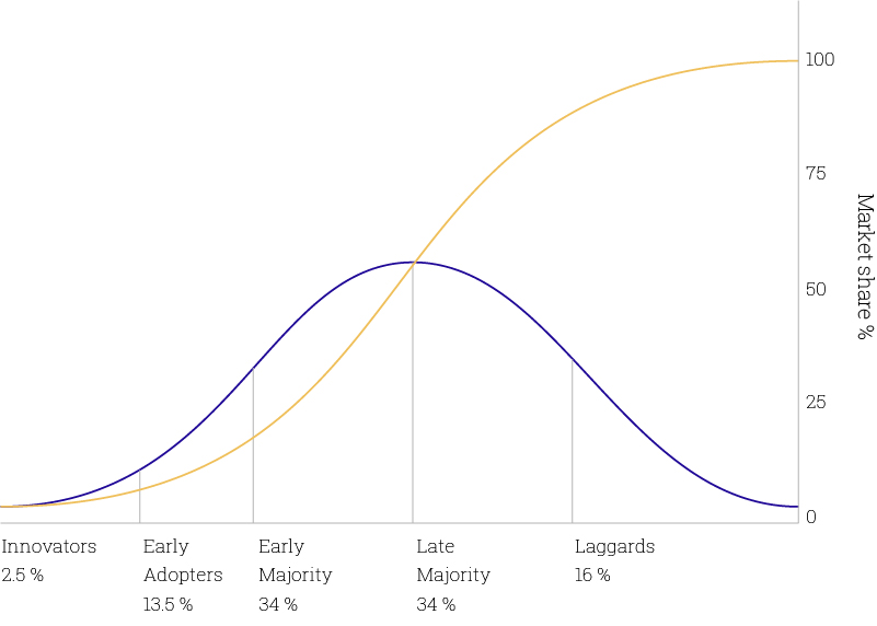 There are 5 categories of adopters within the social system, each with their own traits. Innovators, Early Adopters, Early and then Late Majority finalised with the Laggards. All 5 process must occur for the technology to attain market saturation. Failed diffusion merely implies 100% adoption was never attained before succumbing to technical obsolescence.